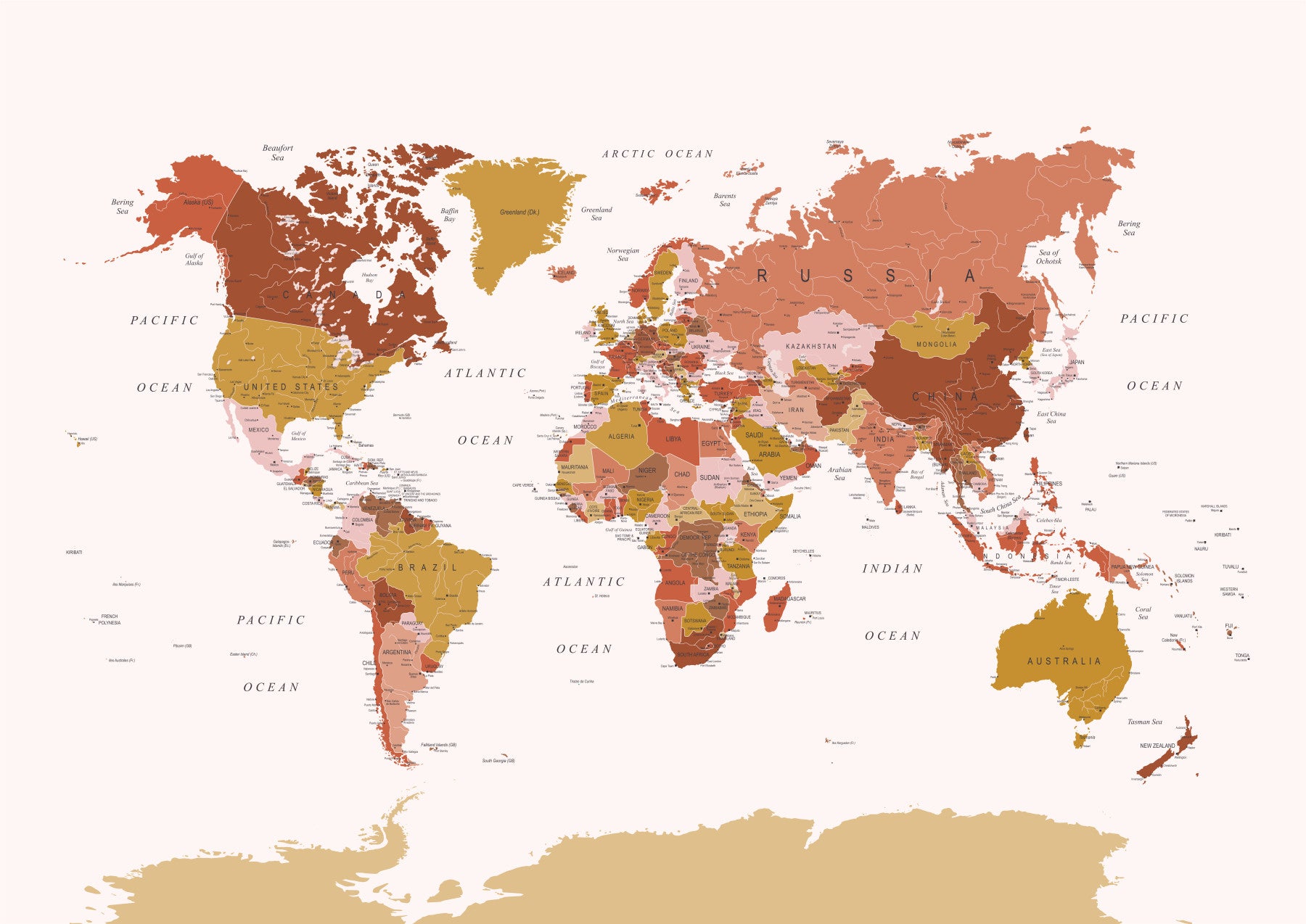 Embark on a visual journey across the globe with this detailed world map wallpaper. Rendered in a sophisticated palette of earth tones, from terracotta to beige, this wallpaper offers a warm and inviting aesthetic to any space. The map meticulously outlines countries, seas, and major cities, making it both visually stunning and educational. It’s an ideal choice for a home office, study, or living room, lending a touch of wanderlust and intellectual curiosity to your interior decor. Explore the beauty of our planet from the comfort of your home.