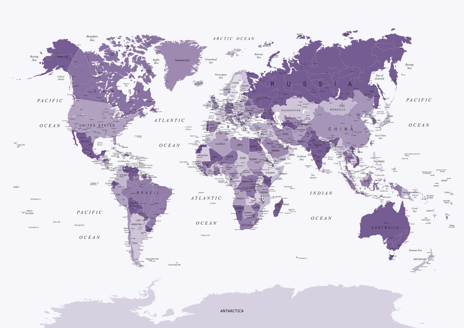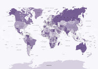 A captivating world map rendered in a sophisticated purple hue. This wallpaper offers a unique and elegant aesthetic, showcasing detailed country borders and major cities in a subtly textured, muted purple palette against a clean white background. The calming color scheme and clear cartography create a visually appealing and peaceful atmosphere, perfect for a study, office, or any space needing a touch of sophisticated style. A refined and modern take on a classic world map design.