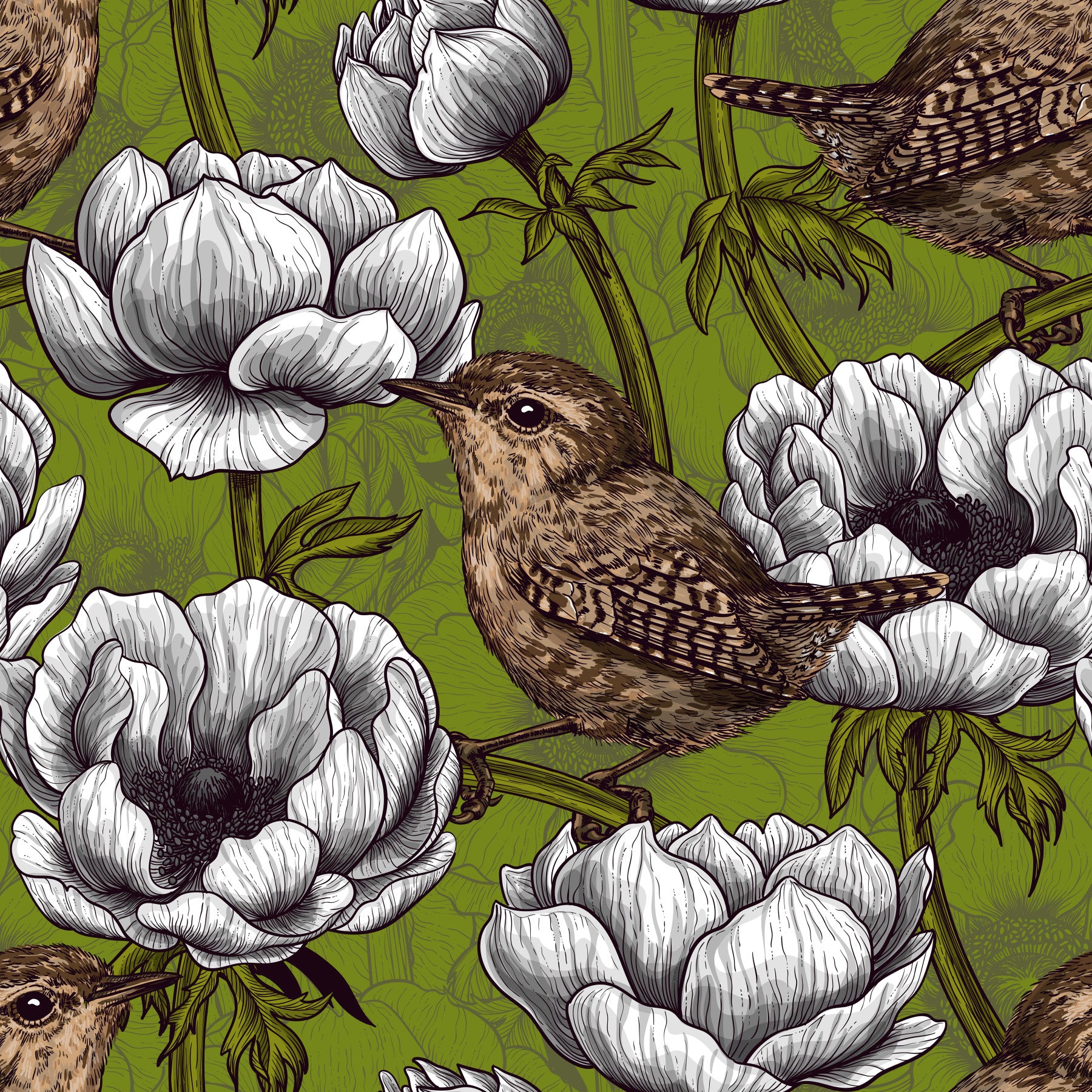Green base in Wrens in the White Anemone Garden wallpaper design
