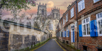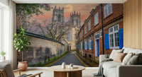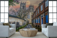 Road through old buildings in York leading to York Minster. Capture the serene beauty of York with this stunning wallpaper. A full moon casts its gentle glow over the historic York Minster and the charming brick buildings lining the street. The image highlights architectural details and the contrast of warm and cool tones. This wallpaper for walls adds a touch of classic elegance to living rooms, bedrooms, or hallways. Let it transform your space with its timeless appeal.