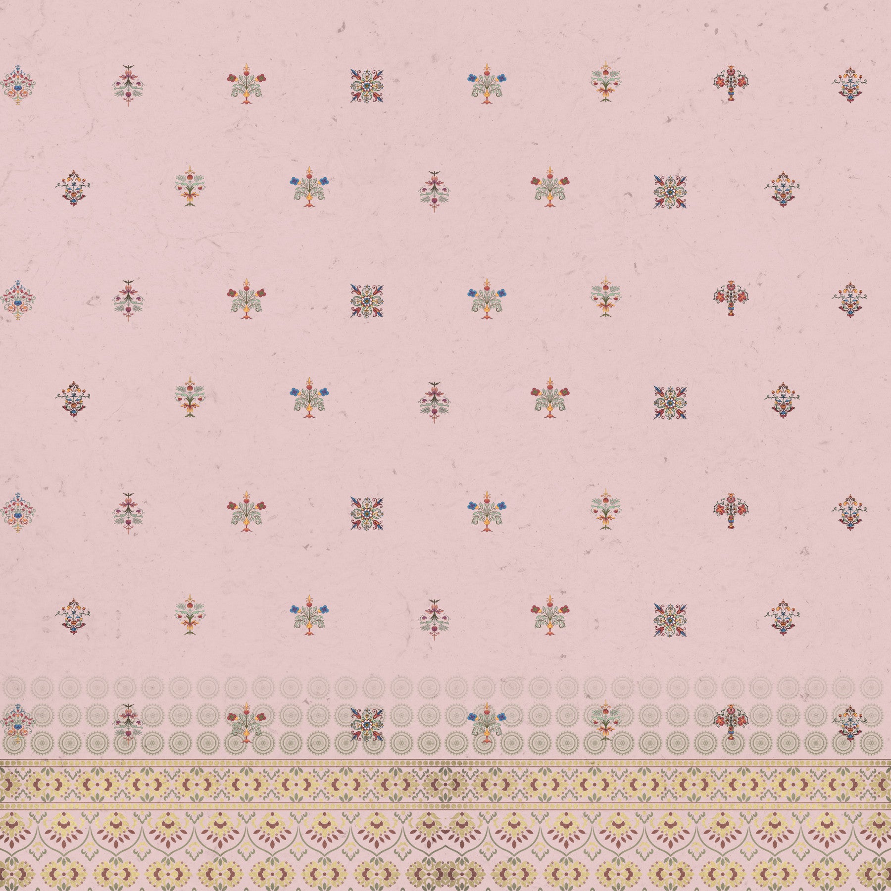 Immerse yourself in the luxurious embrace of 'Zardozi Pink,' a wallpaper that evokes the splendor of traditional Indian craftsmanship. This design features a soft, textured pink backdrop, reminiscent of aged silk, upon which delicately embroidered motifs are scattered. These miniature floral and geometric elements, inspired by Zardozi embroidery, showcase a rich palette of jewel tones, including sapphire blues, ruby reds, and emerald greens, offset by hints of gold. The lower portion of the wallpaper showcases a more ornate border, a band of complex floral patterns and stylized designs. This exquisite detail adds depth and visual interest. 'Zardozi Pink' is perfect for creating a serene yet opulent atmosphere in any room. Let this design transport you to a world of timeless beauty and sophisticated elegance, where traditional artistry meets modern aesthetics.