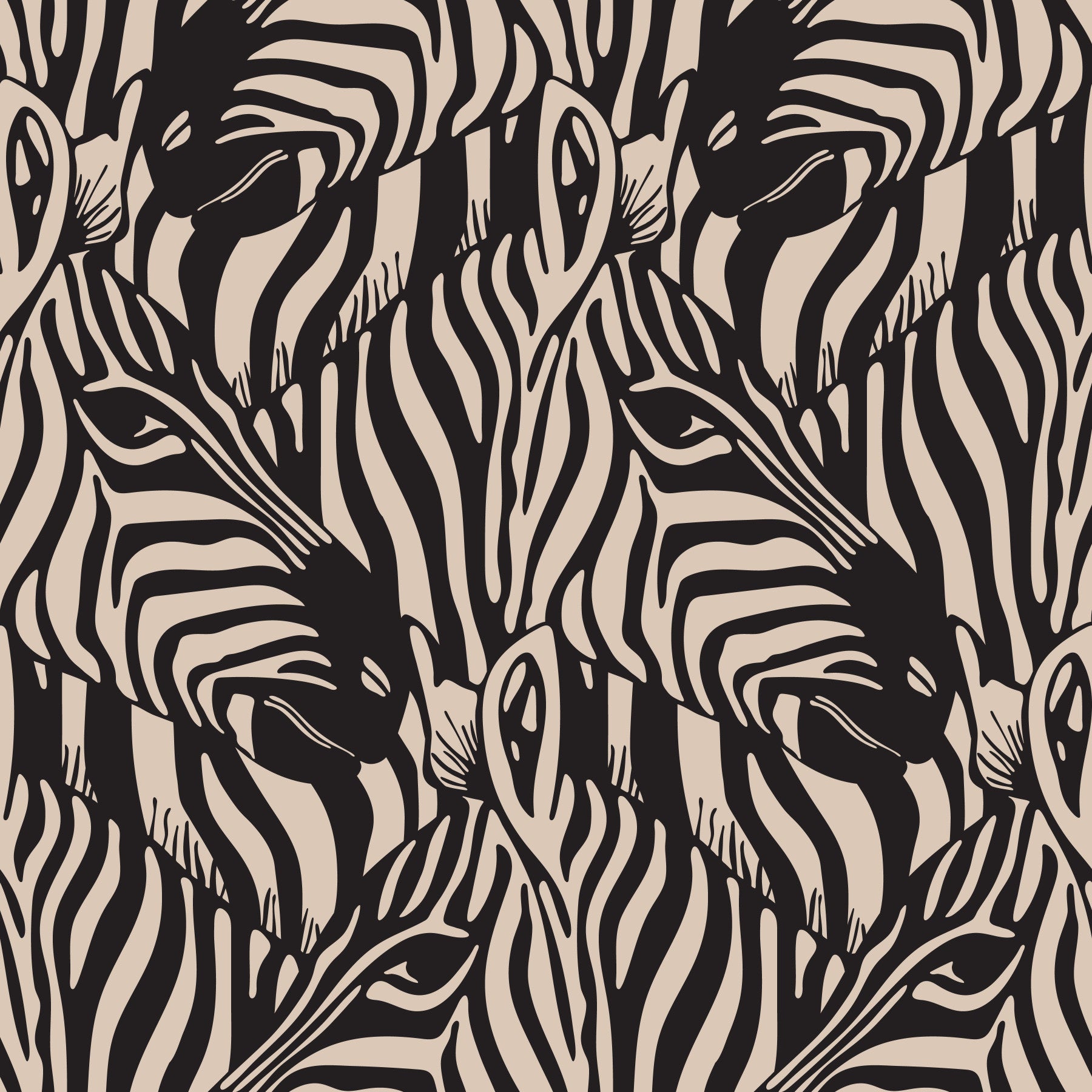 Immerse yourself in the untamed beauty of the African savanna with this captivating bold but warm "Zebra Herd" wallpaper that features a mesmerizing pattern of interlocking zebra heads. The striking contrast between bold black and warm beige creates a visually stunning display that manages to be both bold, graphic and wild, and elegantly neutral, at the same time! Perfect for adding a touch of natural sophistication to any space, this modern take on classic zebra stripe designs brings the spirit of the wild into your home. Whether you're a wildlife enthusiast or simply appreciate refined design, this wallpaper will transform your walls into a work of art. Original wallpaper pattern design by Jackie Tahara of UnBlink Studio.