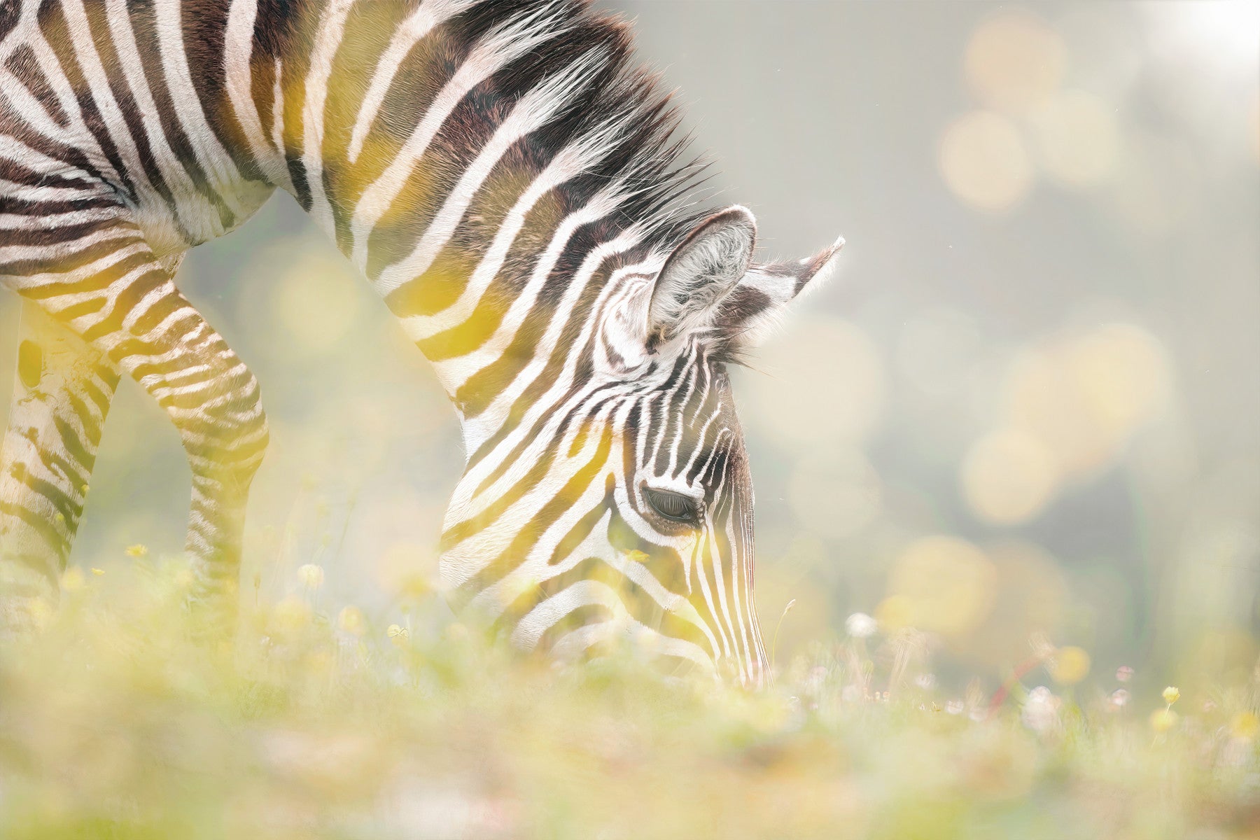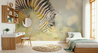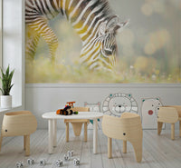 Bring the serenity of the savanna indoors with this calming zebra wallpaper for walls. The delicate focus on the animal amidst a field of soft grass creates a peaceful mood. Its gentle, light colour palette, with hues of beige, white, and soft yellows, effortlessly enhances bedrooms, nurseries, or living areas. This design works wonders as a backdrop for natural light and complements spaces seeking a touch of tranquility.