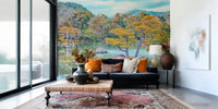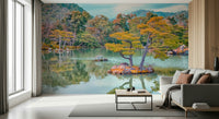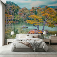 Transform your walls with this serene landscape depicting a tranquil zen garden scene. The design features a mirrored lake, vibrant trees with gold leaves, and soft, muted colours that bring a sense of calm into any room. The reflections create depth and dimension, making it ideal for creating a restful atmosphere in bedrooms, living rooms, or even hallways. This landscape wallpaper for walls adds a touch of nature and peacefulness, enhancing your living space with its subtle, refined beauty. The soft hues complement various interior styles, from modern minimalist to classic decor.