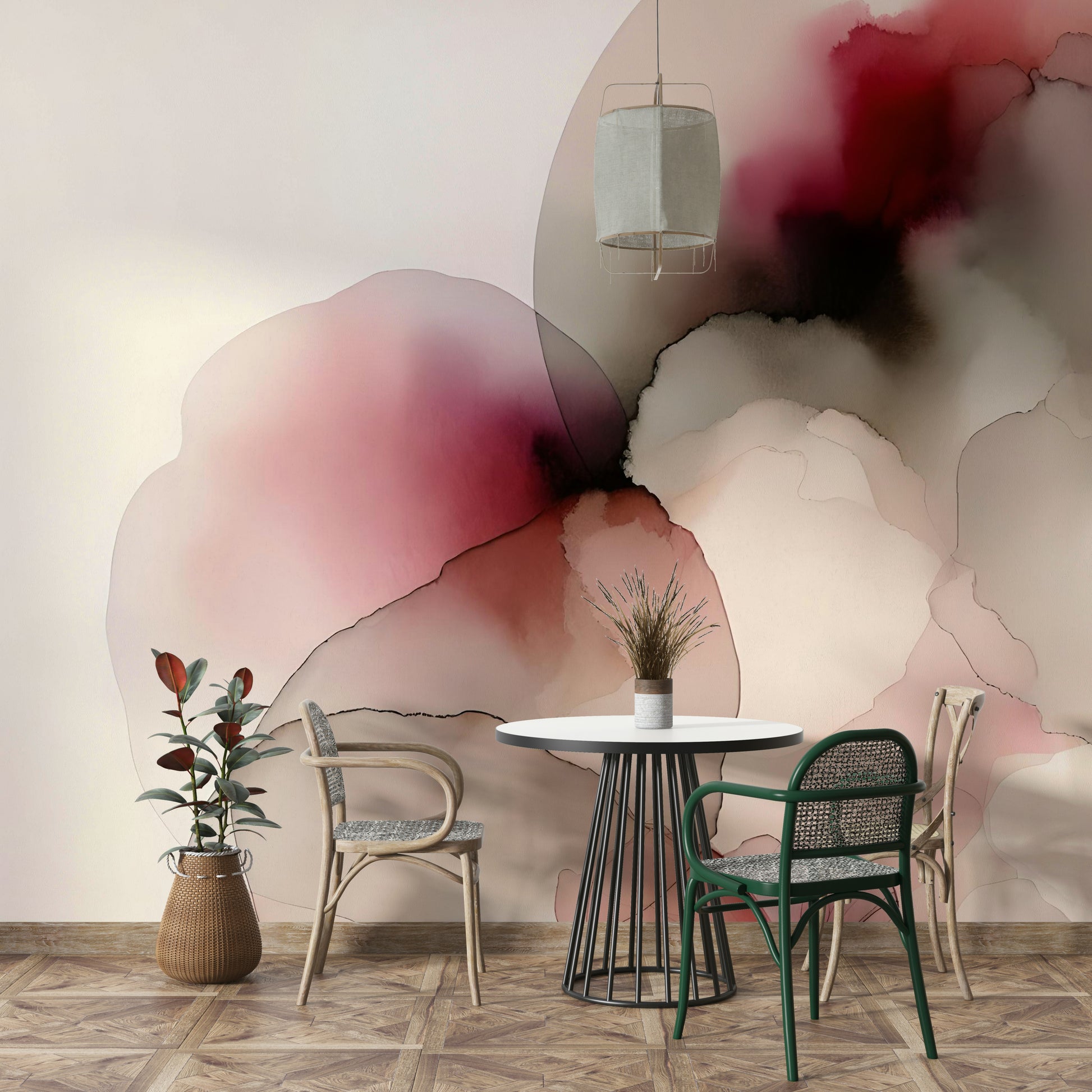 Immerse yourself in the gentle beauty of 'Zen Oasis,' a wallpaper design characterized by a soft and subtle palette. Blush pinks and dusky burgundies gently blend, creating a calming and peaceful atmosphere. The abstract, almost watercolor-like quality of the design lends itself to a variety of interior styles, from minimalist modern to sophisticated contemporary. The organic shapes and flowing lines suggest a natural elegance, making it an ideal choice for spaces needing a touch of understated luxury and tranquility. Perfect for bedrooms, meditation rooms, or any area where a sense of quietude is desired.